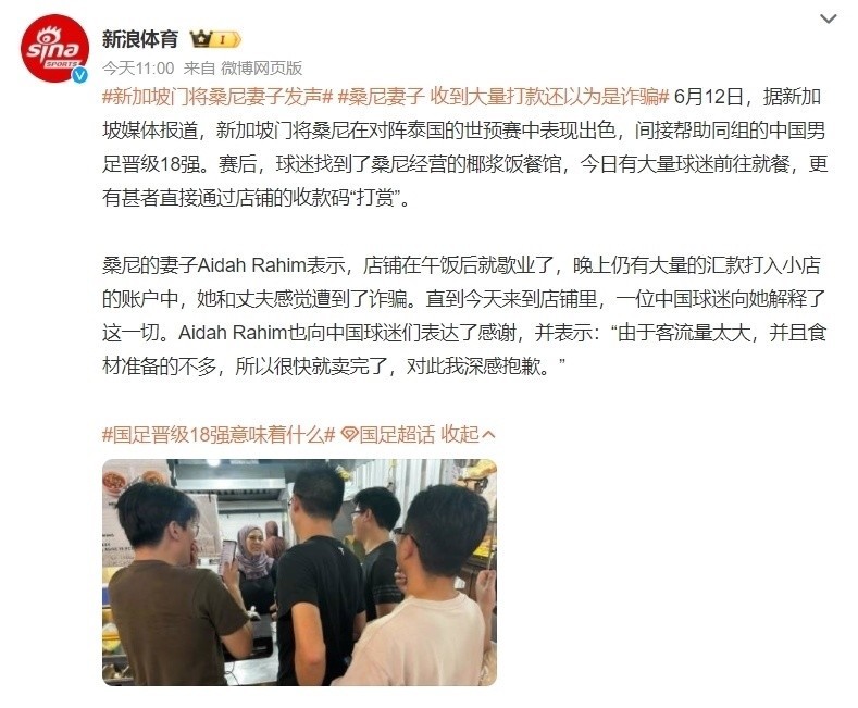 那么寰球知谈我们中国球迷究竟有多荒诞吗?再行加坡与泰国比赛之后,在不到24小时的技能里,整宿之间来自中国球迷的“隔空打赏”接近上百万元东谈主民币!另外,这样的热门当然少不了中国的繁密博主,一位中国博主就专程赶到了桑尼家的椰浆饭馆铺,对桑尼的配头进行了采访,她示意桑尼很快就会复返新加坡,但他的第一站并不是回到店里,因为球队还有一场比赛要踢,而桑尼也通过他的配头向中国球迷抒发了感谢。
