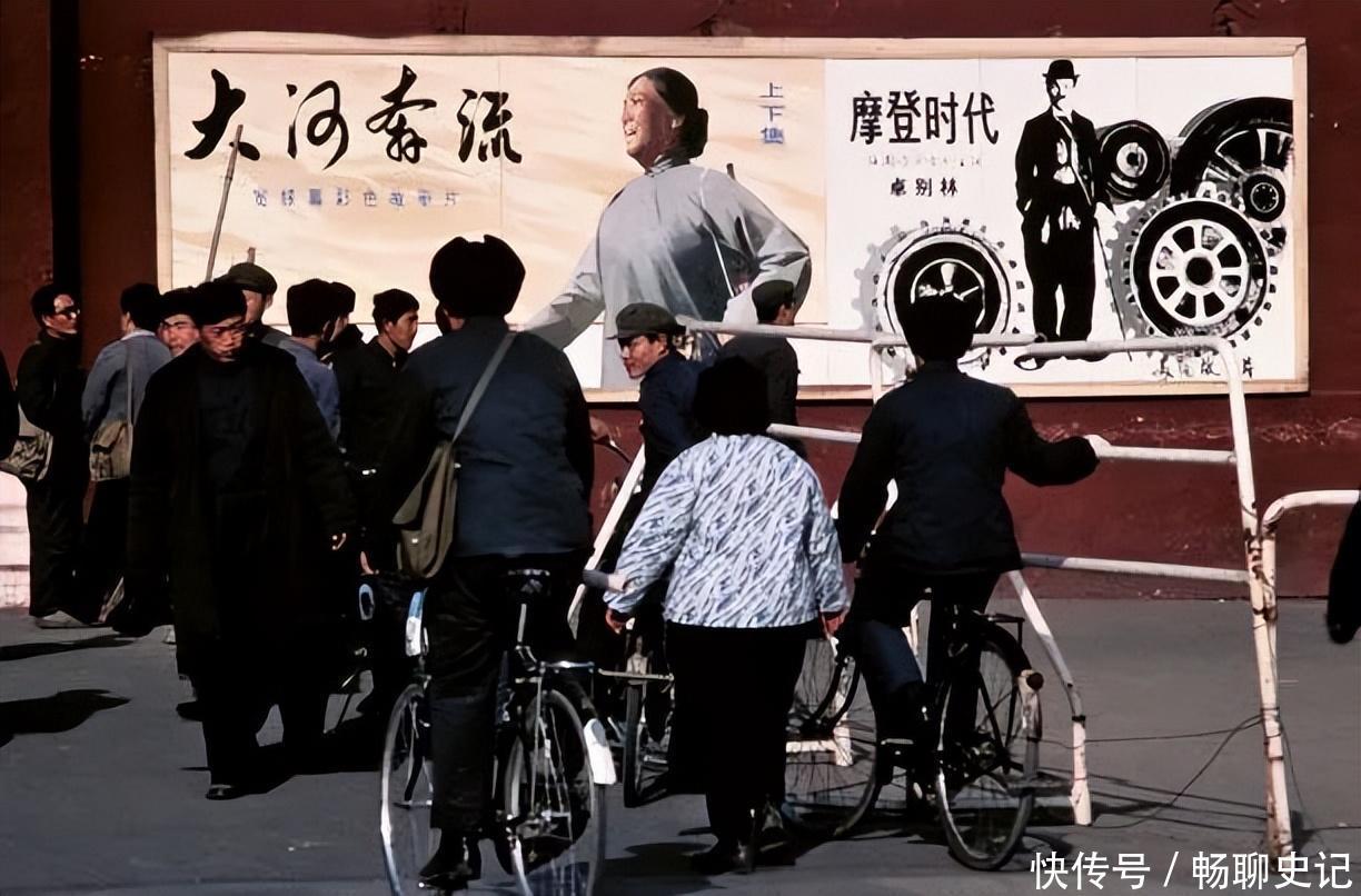 70年代的中国,口角电视机也没提升,大众皆心爱看电影。像片中,是谢铁骊、陈怀皑抓导,张瑞芳主演的经典老电影《大河奔流》海报。右边是卓别林的《摩登期间》海报。