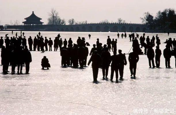 70年代的北京颐和园,冬天时东说念主们心爱在结冰的湖面上溜冰。辽远,在隐否认约之中,不错看到十八孔桥。