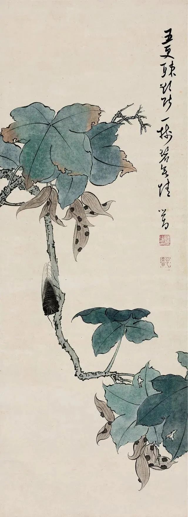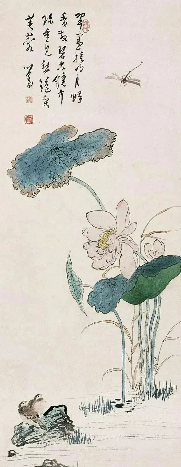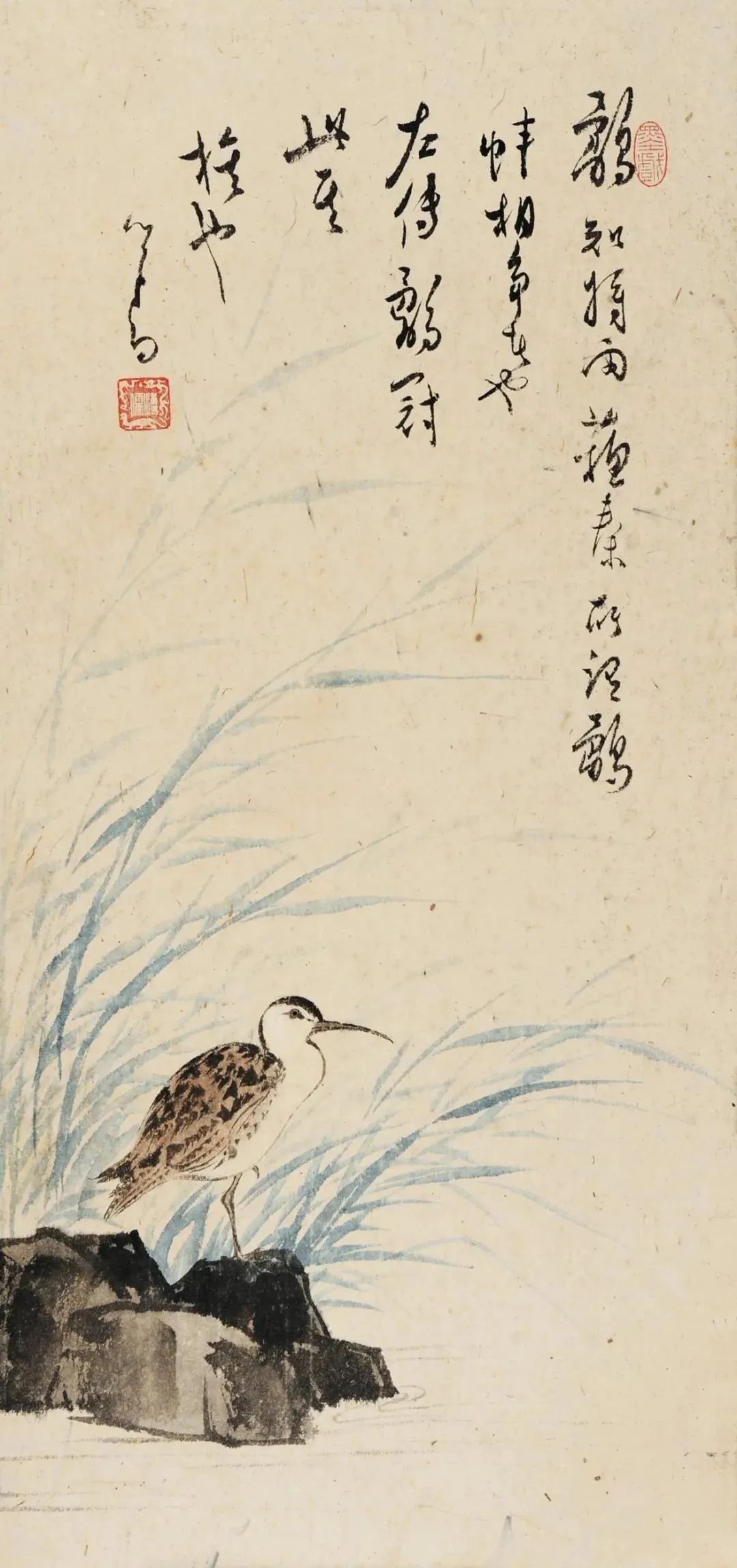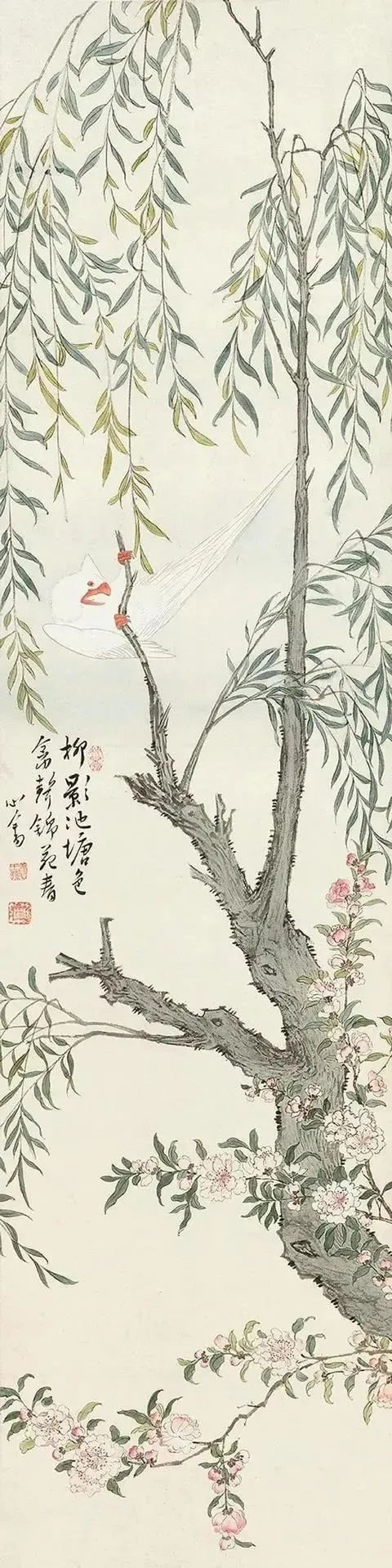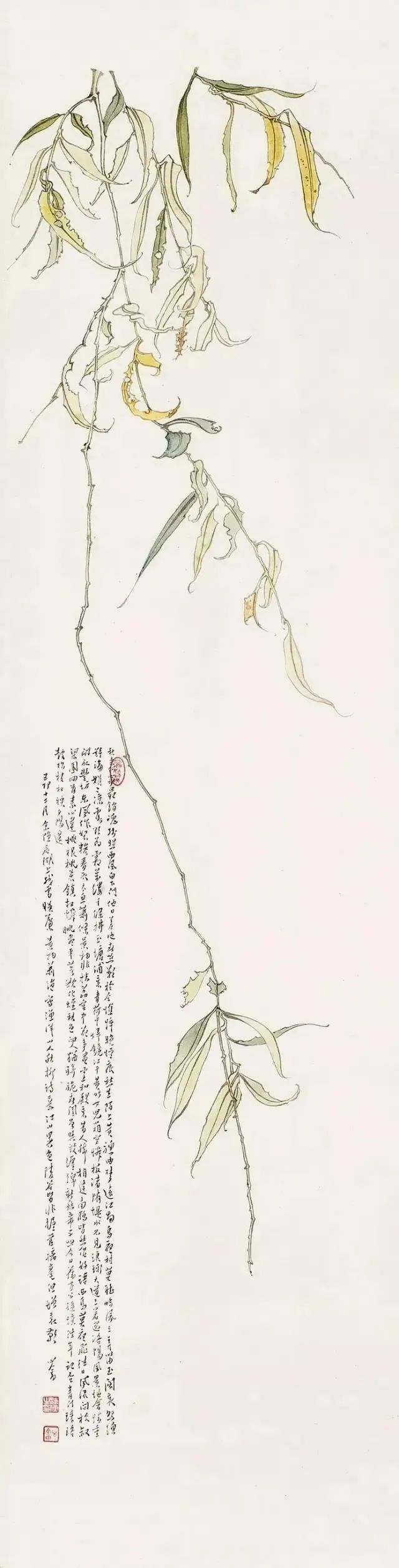 他的画作在山水、花鸟、水族、东谈主物等题材上无一不备,时常以山水和东谈主物较为易见,今天沿途来望望他荒凉的古意花鸟画。