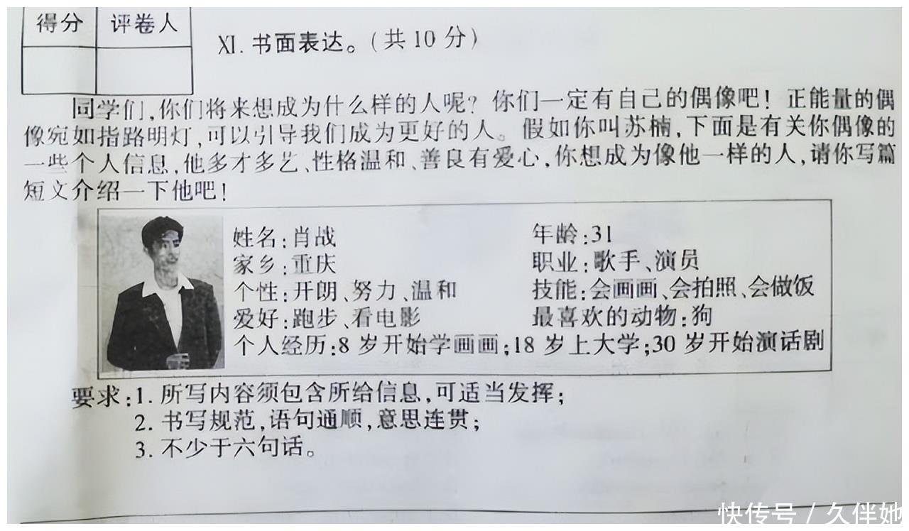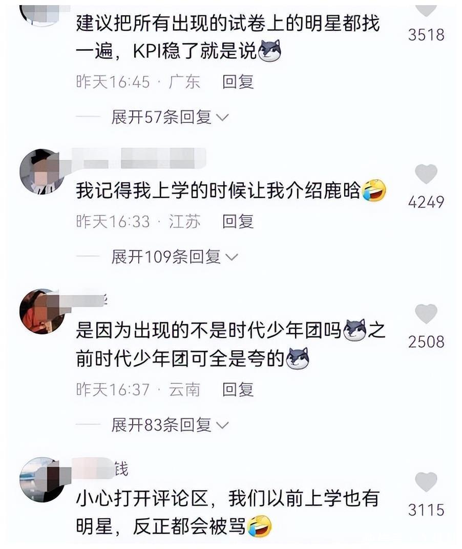 笔者不雅点: 学生要是在作文中提到他,那是学生的一种个东谈主嗜好喜好,但要是是试卷自己就把他写进去,那就有点变相指点学生追星了,而且还提名谈姓了,这就有点给东谈主帮他营销热搜的嗅觉,总认为不是太好! 尤其是出当今小学试卷中,说真话未成年东谈主皆不太适当追星的。而高肃肃卷出现明星更是值得我们深想的事情。