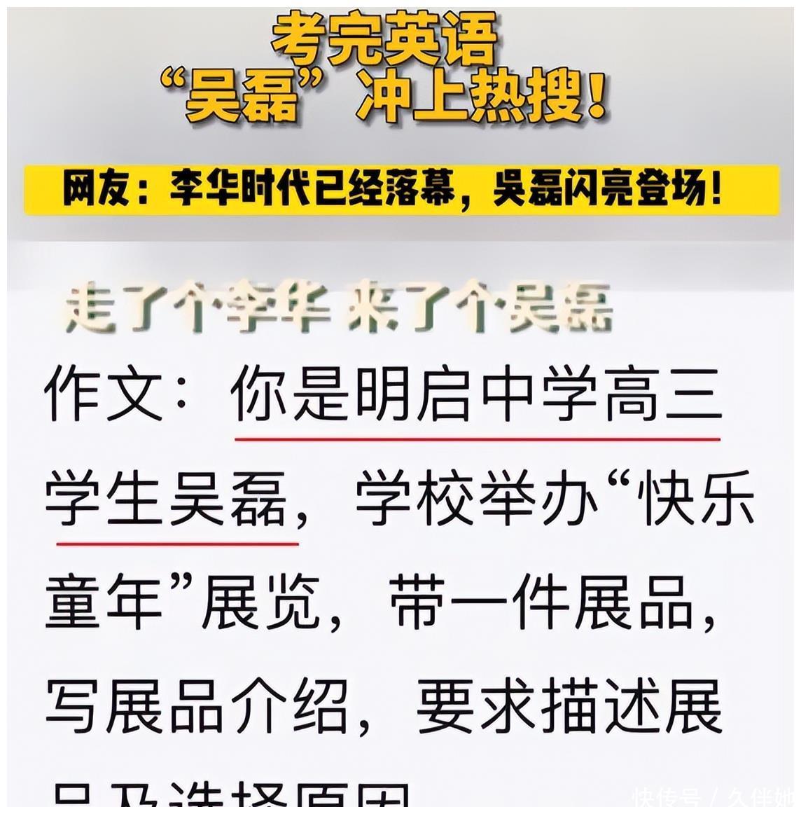 在好多学生们叫好的时辰,我就怕要泼一盆冷水,简直不残酷流量明星进高考考题和课本里。当今在英文试卷中“李华被换成了吴磊”,此吴磊是不是彼吴磊不好说。然则较着这个事情能上热搜,天下心里心知肚明。
