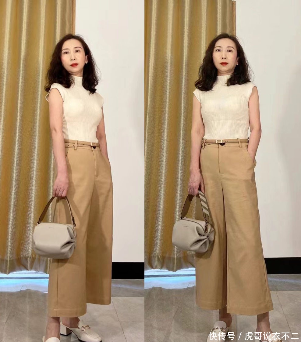 对服安设色还盘算推算的不是很绝对的话,应用基础色搭配不错极地面减少穿搭的出错率,比喻说这身白色上衣配卡其色阔腿裤的组合,看起来低调却不失层次,险阻装综合的对比,更杰出了女性气场中的干练感。