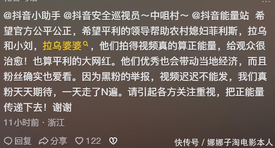 黄金但她应该比拉乌好一些,账号还能发布,拉乌不仅被举报,他们还报复拉乌的婆婆和小姑子,导致拉乌婆婆的账号也停更了。